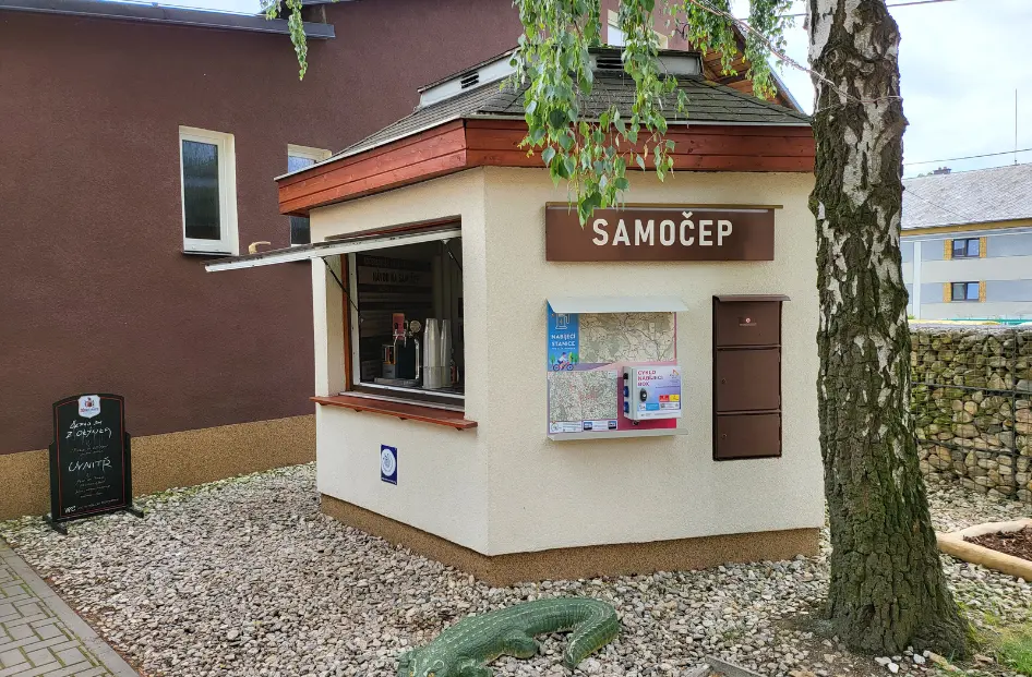 Součástí našeho penzionu je unikátní, plně samoobslužný SAMOČEP. V tomto zařízení se můžete sami kdykoliv občerstvit točeným pivem, několika druhy kávy z automatu, nealkoholickými nápoji nebo nějakou cukrovinkou. Díky své poloze na Moravské stezce je vyhledávaným cílem cyklistů, vodáků a turistů, kteří objevují krásy Jeseníků nejen po trase této známé cyklostezky. Pro hosty SAMOČEPU je k dispozici posezení pod velkým zatepleným stanem a samozřejmě sociální zařízení.